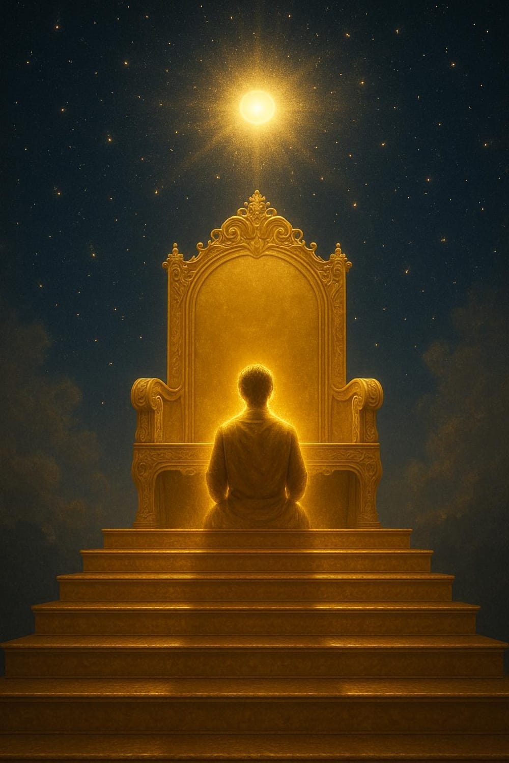 Dus ja hoor, ik liep de trap op en nam plaats op de grote gouden troon, de zetel van de ‘machtige God’ die het universum schiep door met zijn vingers te knippen.
